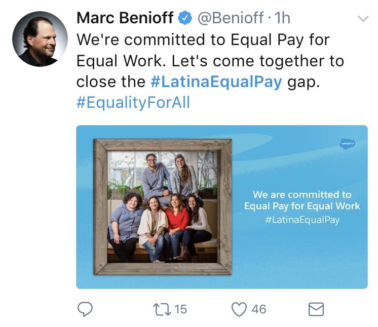 Marc Benioff CEO of SalesForce, one of the largest technology employers committed to diversity and inclusion tweeted #LatinaEqualPay