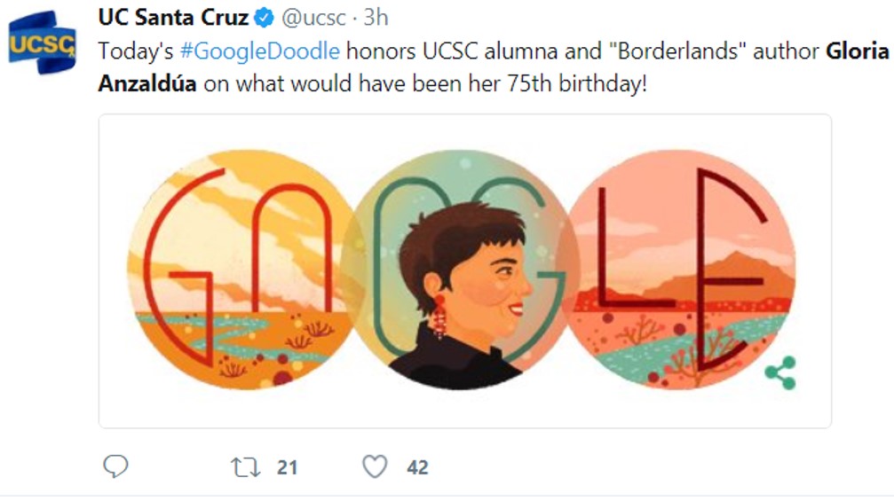 “For a writer and scholar Gloria E. Anzaldúa, a border wasn’t just a line on the map: it was a state of mind and a viewpoint on life. Born on this date of 1942 in the Rio Grande Valley, Anzaldúa possessed an astounding gift for transforming dividing lines into unifying visions”, noted by Google.