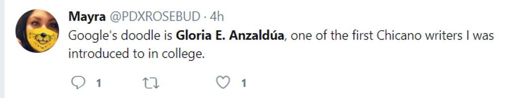A Google doodle honored her today displayed her trademark style of short hair and lengthy earrings with illustrated images of the Rio Grande, Texan-Mexican borderland fronteras. Anzaldúa had a great appreciation of her ‘borderland’ surroundings and her writing captured the borderland injustices as well whether it was the segregated school system in Texas, as a once migrant farmer experiencing first hand blatant racism/sexism.